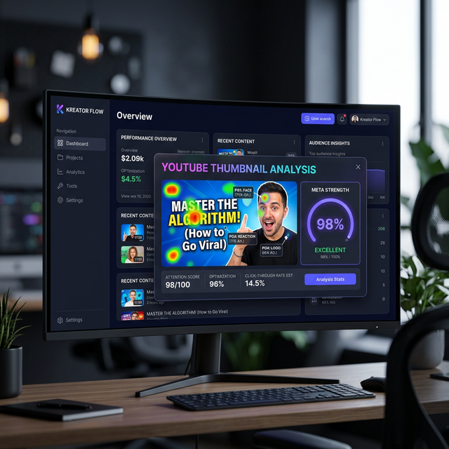 Stop guessing. Kreator Flow reverse‑engineers top-performing thumbnails in your niche to generate high-CTR concepts that put your brand at the center of the YouTube home page.